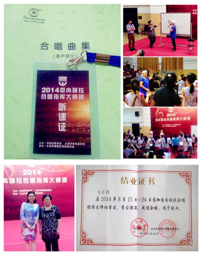 燕赵星童声合唱团牛诗棋老师参加了大师班的学习。学习内容包括:童声合唱作品的读谱与指挥、童声合唱作品的读音、观摩童声排练、委内瑞拉的音乐教育、音乐会等内容组成;授课地点在:朝师附小、中山音乐堂和国家大剧院;金帆合唱团展览路一小分团的小朋友们担任大师班期间的示范合唱团;国际指挥大师maria教授、吴灵芬教授及吴老师弟子青年指挥家田浩老师为大家授课,两位大师所教授的是目前国际上最先进童声合唱训练方法,曲目也都是整理的拉美地区新创作的儿童合唱歌曲。每天早上8点半至晚8点半的学习非常充实,小朋友们和专家老师表现出同样的热情和敬业精神。